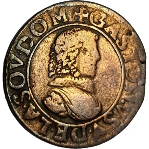 | Obverse description | Bust on right Bust to the right of Gaston d`Orléans , bare head, milled collar, with long curly locks. Beginning of legend at 12 o`clock, smooth circle. |