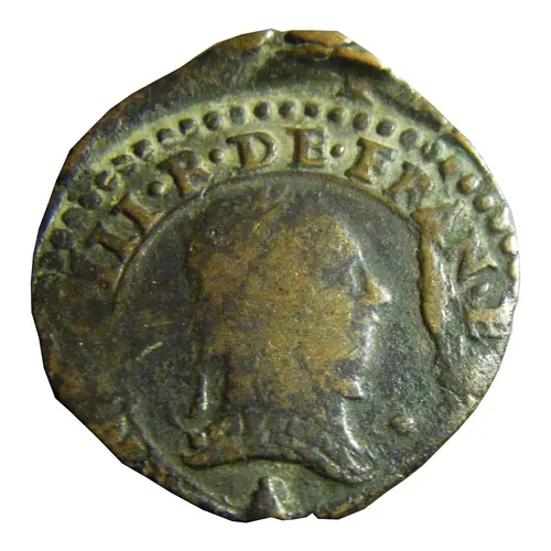 Start of legend at 12 o`clock with a cross pattée. 14 mm circle. Three lilies 2 and 1. Arrowhead or fire flame (depending on the author): Mm Jean DE LA HAYE (1591-1594) |