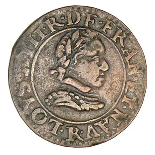 | Mô tả mặt trước | Childish bust of Louis XIII, laureate, draped and cuirassed right with large flat raised collar. |