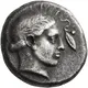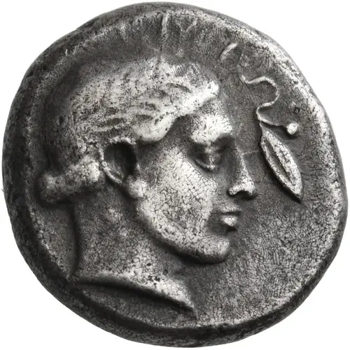 | Beschrijving voorzijde | Laureate head of Apollo to right, his hair in a roll at the back of his head; in the field to right, laurel leaf and berry on a twig. |