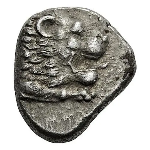 | Obverse description | Forepart of lion facing right, with open jaws and outstretched right paw. |