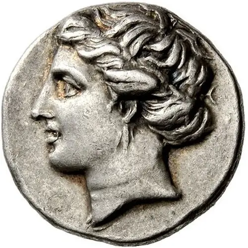 Aversbeschreibung Head of the nymph Euboia to left, wearing a triple pendant earring and with her hair rolled on top of her head