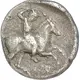 Thessalian rider galloping to the right, wearing a petascus, chiton and lagobolon. At the four corners of the hollow square, letters signifying: PHAR (ALE). |