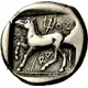 | Reverse description | Bridled horse trotting to left, reins trailing on the ground. Behind, trident, all within shallow incuse square |