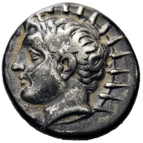 | Opis awersu | Youthful head of Helios to left on radiate solar disk |