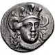 | Descrizione del dritto | Head of Athena facing slightly right, wearing triple-crested Attic helmet, disc earrings, and necklace. |