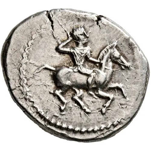 | Obverse description | Warrior on horseback to right, holding reins in his left hand and brandishing spear with his right. |