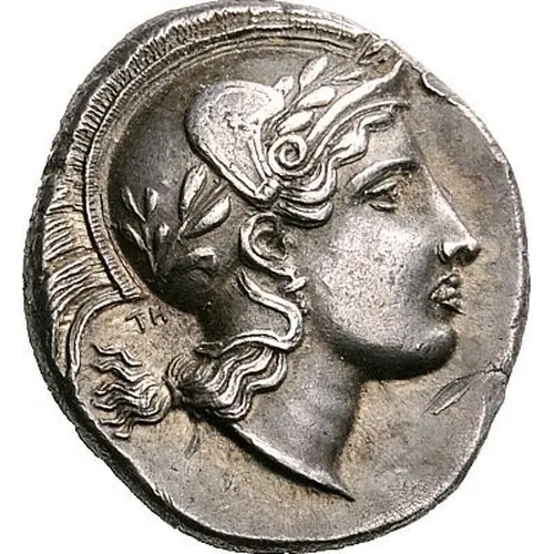 | Obverse description | Head of Athena to right, wearing pendant earring, crested Attic helmet adorned with an olive wreath, and with raised cheek pieces. In tiny letters behind neck, ΤΗ |