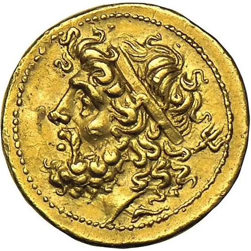 | Aversbeschreibung | Bearded head of Poseidon left, wearing taenia, trident behind; dolphin below. |
