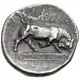 | Arka yüz açıklaması | Bull butting left on tablet with AK monogram and inscription above |