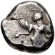 Reverse description Griffin standing facing left, with right forepaw raised, with quadripartite incuse square