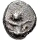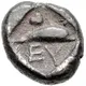 | Reversbeschreibung | Dolphin diagonally right; silphion fruit above; all within incuse square. |