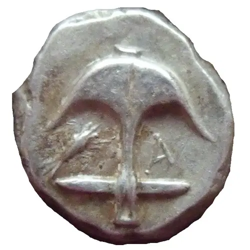 | Descripción del anverso | Anchor reversed, cantoned with a crayfish on the left, and the city`s ethnic symbol on the right: (pollonia Pontica) |