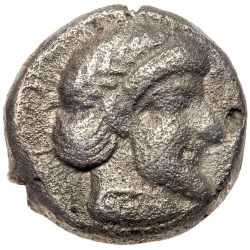 | Aversbeschreibung | Archaic-style laureate bearded male head (Zeus?) right. |