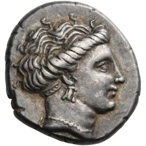 | Opis awersu | Head of the nymph Chalkis to right, wearing triple-pendant earring and necklace, her hair rolled at the sides and back. |