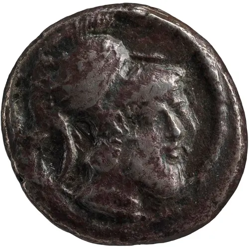 | Описание аверса | Bearded head right, wearing crested Corinthian-type helmet |