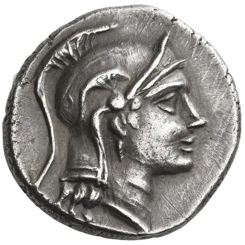 | توضیحات روی سکه | Head of Athena right, wearing triple-crested Attic helmet and single-pendant earring. |