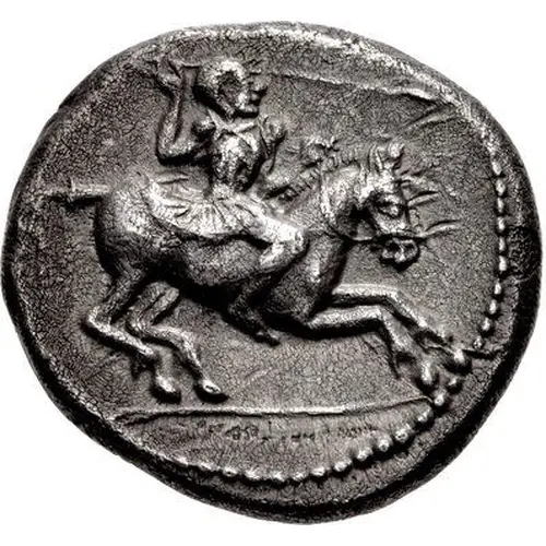 | Obverse description | Warrior (Mopsos) on horseback right, brandishing spear. |