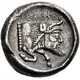 | Obverse description | Nude rider, his long hair in a queue at the back of his head, holding the reins in his left hand and a kentron or goad in his right, with both of his legs on the right side of his horse, preparing to jump down and run alongside. |