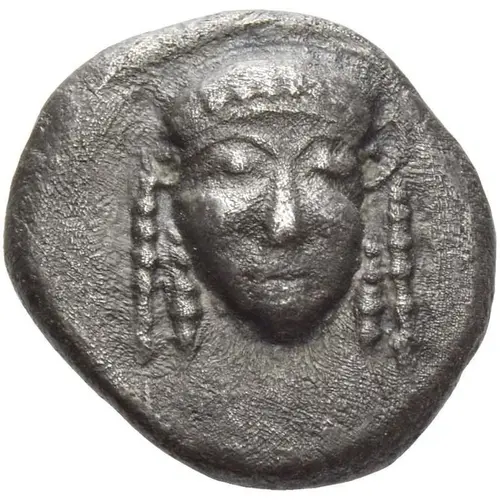 Beschrijving voorzijde Pearl-diademed head of Apollo facing.