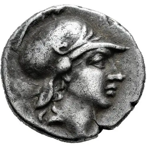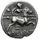 | Reverse description | Helmeted and cuirassed horseman holding spear and shield, charging right; behind grain ear and below monogram. |