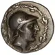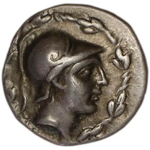 | Popis líce | Male head right, wearing crested helmet, within laurel wreath. |