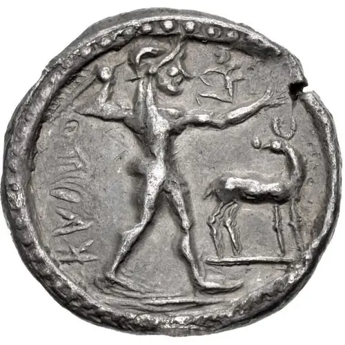 | Obverse description | Apollo striding right, brandishing laurel branch in his upraised right hand and with small figure running right on his outstretched left arm, his head turned back to look at Apollo. To right, stag standing right, head turned back to left and all within cable border |