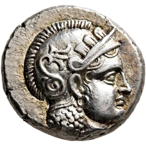 | Obverse description | Head of Athena to right, wearing crested Attic helmet decorated with three olive leaves and palmette. |