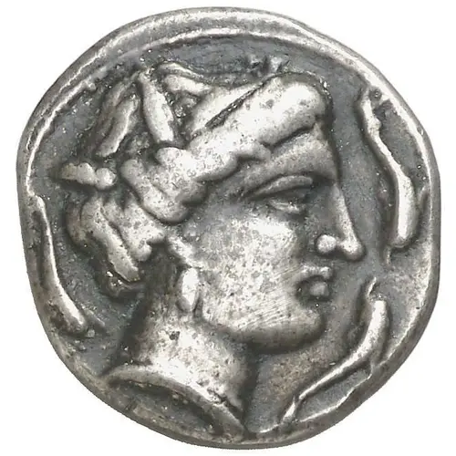 Obverse description Female head crowned with ears of wheat right, three dolphins around.
