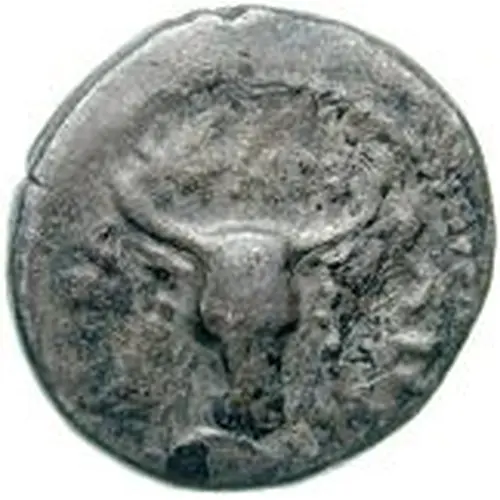 Obverse description Bull`s head facing, with fillet, lettering divided. Border of dots.