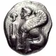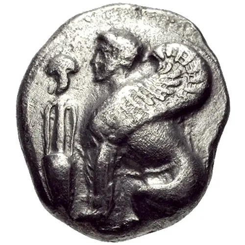 | Obverse description | Sphinx seated left and to its left, a grape bunch above an amphora and all set on circular convex field |