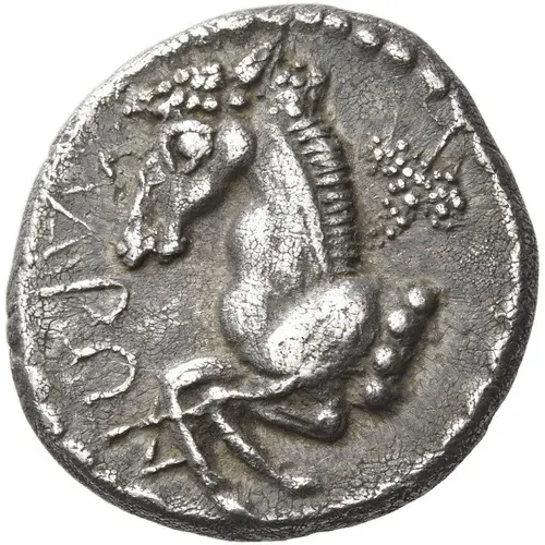 Forepart of horse left; above, bunch of grapes.