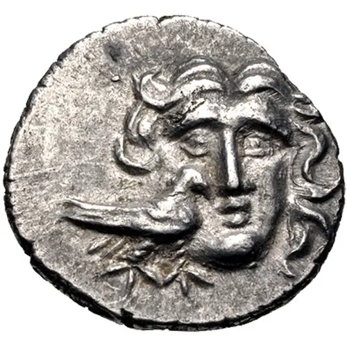 | Obverse description | Head of Helios facing with a bird at his left cheek |