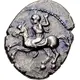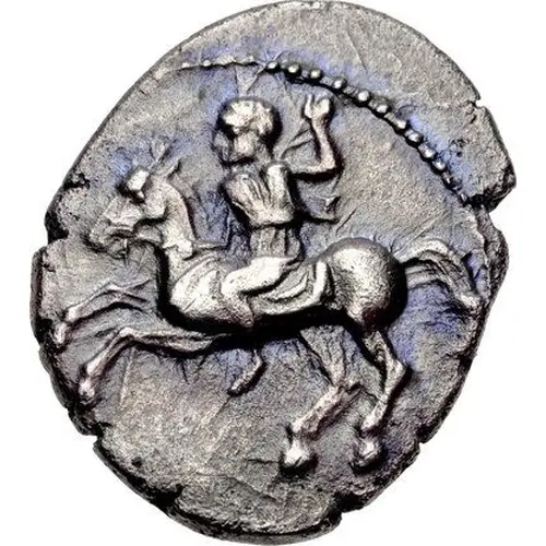| Obverse description | Warrior, preparing to cast spear, on horse rearing left. |