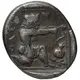 | 裏面の説明 | Herakles, wearing lion skin, kneeling right, drawing bow; ΘAΣION around, pomegranate to right; all within linear square. |