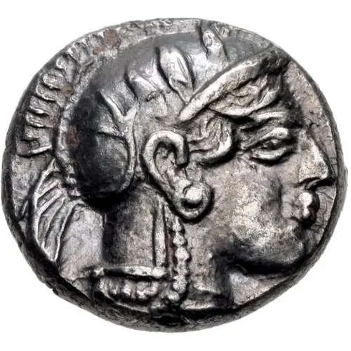 | Описание аверса | Head of Athena right, with frontal eye, wearing earring, necklace, and crested Attic helmet decorated with three olive leaves over visor and a curved palmette on the bowl. |
