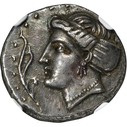 | Obverse description | Head of nymph left, hair in sakkos; aphlastron to left. |