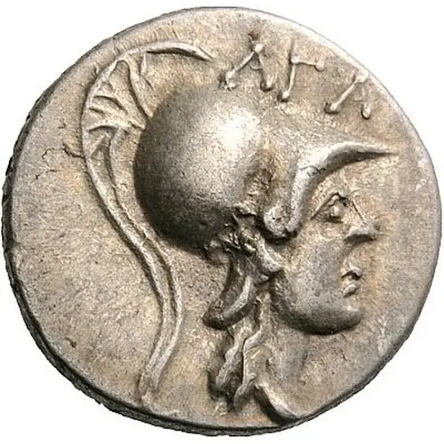| Описание аверса | Helmeted head of Athena to right and above, ΑΓΑ. |
