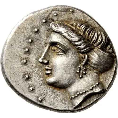Descrição do anverso Head of the nymph Sinope to left, her hair in a sakkos, wearing a triple pendant earring and a pearl necklace