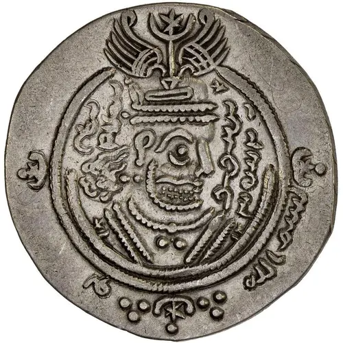 | Obverse description | Sasanian bust right with winged, mural crown in two circular borders. Three Stars in crescents and pellets in margin. Pahlavi legend: governor`s name (HAKAK Y YWSPAN), MN in ObQ3. |