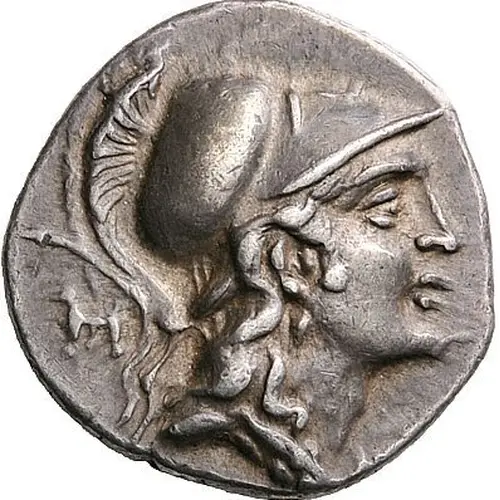 | Descrizione del dritto | Head of Athena to right, wearing crested Corinthian helmet with plain bowl and behind, a monogram |
