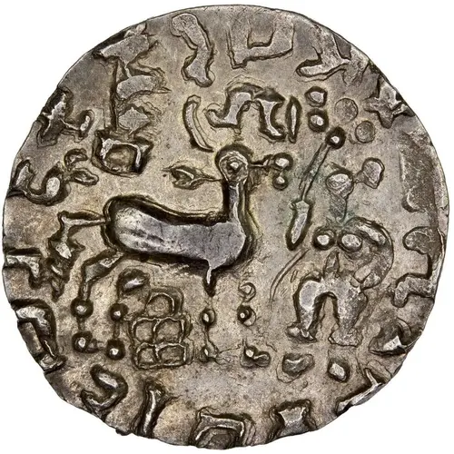 | Obverse description | Deer with Godess Lakshmi, with Vase, Yupa and lettering. Stylised Hill below deer. |
