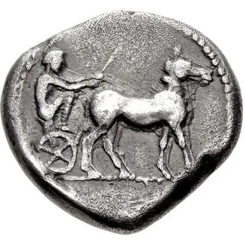 | Popis líce | Charioteer driving slow biga of mules right. |