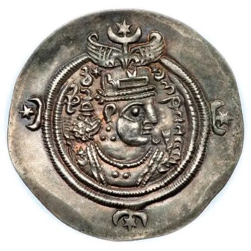 | توضیحات روی سکه | Bust of Azarmidokht right, wearing mural crown with frontal crescent, two wings, and star set on crescent, ribbon on left shoulder, crescent and ribbon on right, stars flanking crown, star-in-crescents in margin. |
