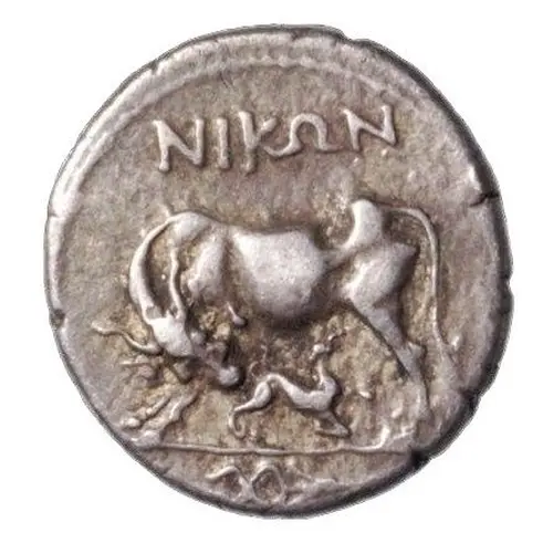 Obverse description Cow standing left with suckling calf, magistrate name above, caduceus (staff of Hermes) below. Dotted border.