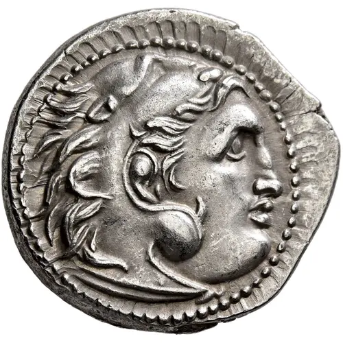 Obverse description Head of beardless Heracles right wearing lion skin headdress.
