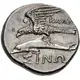 | Reversbeschreibung | Sea eagle on dolphin left; magistrate name below eagle’s wings, ΣINΩ in exergue. |