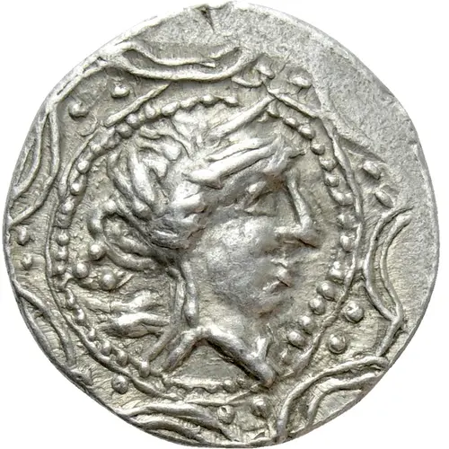 | Obverse description | Diademed and draped bust of Artemis right, with bow and quiver over shoulder; all in center of Macedonian shield. |