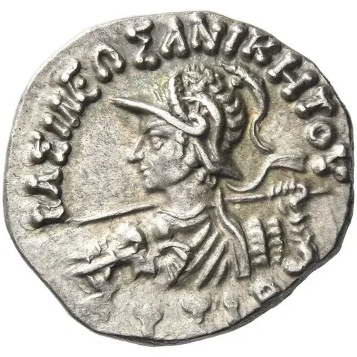 Diademed bust left, wearing crested helmet adorned with bull`s horn and ear and elephant’s skin on left shoulder, brandishing spear over right shoulder. |