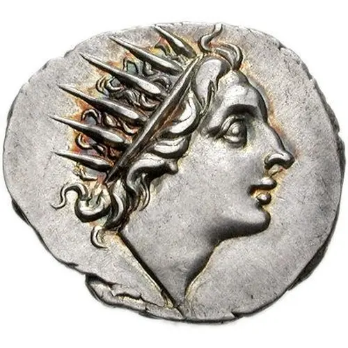 Mô tả mặt trước Radiate head of Helios, three-quarter facing to right.